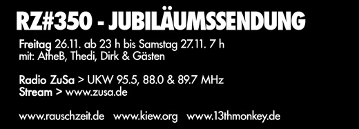 Aufmerksame Hörer wissen es bereits – wir nutzen jede Gelegenheit für wilde Jubiläumsfeiereien – nach der 12 Stunden Sendung zum 12jährigen Geburtstag ist es mal wieder soweit: Wir feiern 8 Stunden lang die 350. Sendung Rauschzeit! Los geht’s am Freitag, den 26. November um 23 Uhr und enden wird die Sendung dann am Samstag, den 27. November um 7 Uhr – mit dabei live am Mikrofon das R-Team bestehend aus 13th Monkey-Member Thedi, sowie AtheB, Dirk und zahlreiche (Spontan-)Gäste, zu denen Ihr auch zählen könnt – einfach bei uns melden.