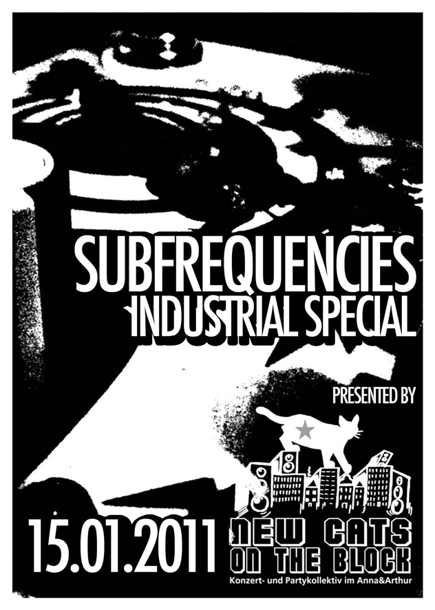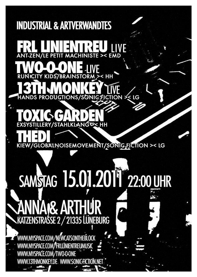 It’s time for noise in Lüneburg! For that reason we joined creative forces with the New Cats On The Block and present you the 2nd edition of the Subfrequencies at the Anna & Arthur in Lüneburg on January 15th 2011! Three liveacts – Frl. Linientreu, Two-O-onE, 13th Monkey – and also two djs toxic_garden and Thedi – will bass your ears with lots of industrial and related stuff!