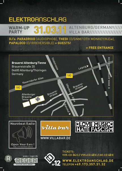 Elektroanschlag time! On April 1 and April 2, 2011 the 12th issue of the Elektroanschlag festival is happening in Altenburg! Besides an extensive live lineup a warmup party is held at the Villa Bar Altenburg on thursday, the 31st of March. Thedi is also djing there – and the entrance is free! Tickets for the Elektroanschlag 12 festival you can get here: elektroanschlag.de. On friday there will be an aftershow party djset by missonic & Thedi and on saturday Heimstatt-Yipotash will play a special aftershow liveset.