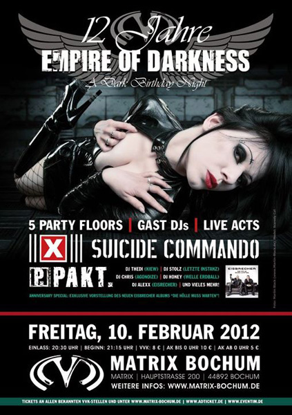 On Friday, February 10, 2012 the Empire Of Darkness will party it’s 12th birthday with a big event on 5 floors at the Matrix Bochum! On that special night you will get two livebands (Suicide Commando and Pakt.) and five extra guest-DJs and also the EOD-resident-DJs. Spinning noisy tunes on the industrial floor besides resident-DJ Leif (Mono No Aware): Thedi (KiEw / Globalnoisemovement)!
